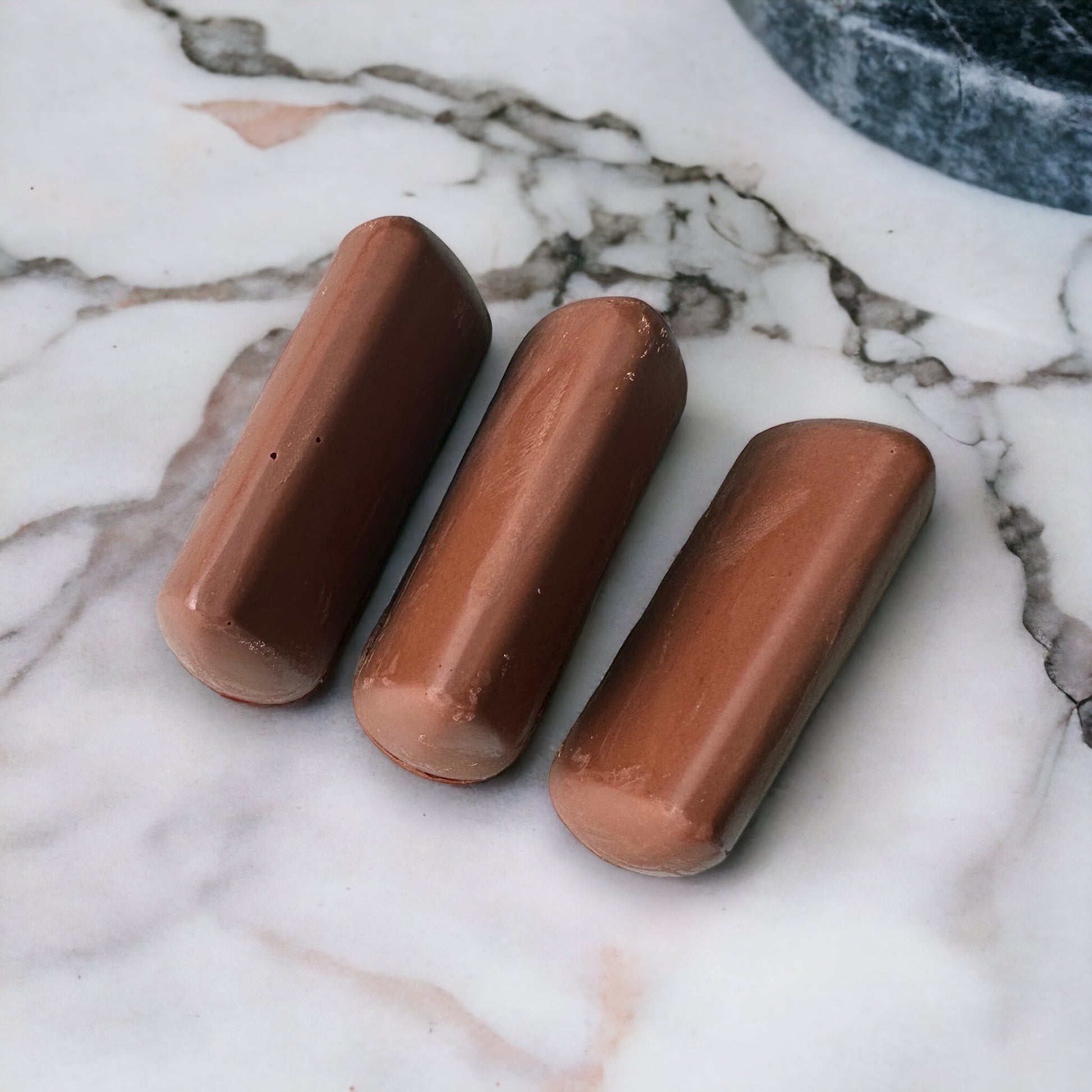 We offer our gianduja in two shapes; assorted flowers or canoes. Both packages have three confections inside.